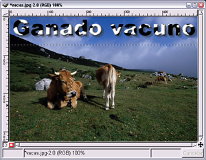 - Hacemos invisible el fondo blanco y mezclamos las dos capas visibles, para unir en una sola capa el efecto conseguido a la sombra del texto. Esta capa vamos a llevarla sobre la siguiente imagen de un prado con vacas (Para obtener la imagen usa el procedimiento habitual, clic sobre la imagen. Se abre una nueva ventana y allí haz clic dercho sobre la imagen y elige Guardar destino como...).