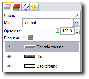 - Con esta imagen abierta en GIMP vamos a la Ventana capa y movemos la capa a la imagen de las vacas. Éste es el resultado: