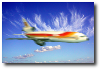 Parece que no ha cambiado nada, pero movamos la capa de texto, que hemos desenfocado, 5 píxeles a la derecha y otros tantos abajo. Seleccionamos las dos capas de texto y las ponemos justo encima del avión, como fondo tendrán las nubes.