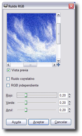 Los parámetros pueden ajustarse de modo independiente, proporcionando ruido de color cuyo valor aumentemos o disminuímos entre 0 y 1.