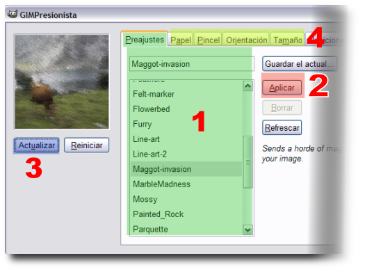 Vamos a partir de la imagen utilizada en el filtro anterior. Seleccionamos el filtro GIMPresionista.