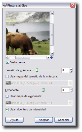 Abre el cuadro de diálogo del filtro Óleo, aplica diferentes tamaños de máscara y activa/desactiva la opción "Usar algoritmo de intensidad". La siguiente imagen se ha obtenido activando esa opción, con un tamaño de máscara de 10 y usando como mapa de exponente la misma imagen y con un valor de 10.