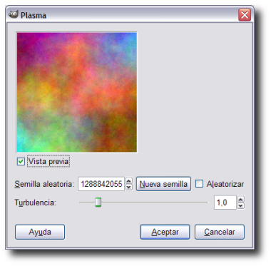 Podemos introducir una semilla o dejar que GIMP nos proporcione una aleatoria. El valor de Detalle oscila entre 1 y 15. Podemos hacer el humo turbulento y enlosable (dando la sensación de formas repetidas).