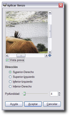 La profundidad de la textura simula el lienzo sobre el que pintamos. No conviene poner valores muy elevados porque perdemos la sensación de lienzo que proporciona este filtro. |