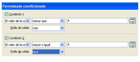 Por último escribimos los valores que son términos de la comparación. En nuestro caso el 4. Con ello conseguiremos que el estilo rojo aparezca cuando el valor es menor que 4 y el azul cuando es mayor o igual a 4. No es necesario usar el mismo valor para las dos condiciones, pues el azul podríamos haberlo definido como mayor que 3.