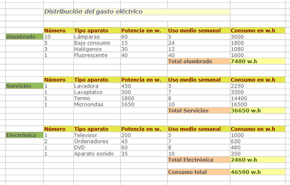 En una vivienda actual existen muchos aparatos que consumen electricidad. Un ejercicio elemental, que se puede desarrollar en las clases, y que ayuda en las primeras etapas del aprendizaje de la Hoja de Cálculo, es el de resumir en un esquema, en varios apartados, el gasto de todos esos aparatos.