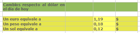 Puedes usar los datos contenidos en la figura para comprobar que tus cálculos son correctos. Toda la zona de color amarillo claro deberá estar llena de fórmulas. Por ejemplo, el 27,370 resulta de multiplicar la cantidad en euros por el cambio dólar-euro. Todas las fórmulas consistirán en multiplicaciones, divisiones o ambas. Evidentemente, has de usar referencias de celdas y no cantidades: =D19*G8/G9, =D17/G16 , etc.