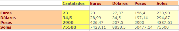 Sobre estos datos debes construir una calculadora en la que dadas unas cantidades en cualquier moneda, se traduzcan de forma instantánea a las demás. Puedes usar este esquema u otro similar: