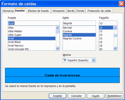 Señala con el ratón la celda del título: Cesta de inversiones. Observa los datos de la barra de objetos: