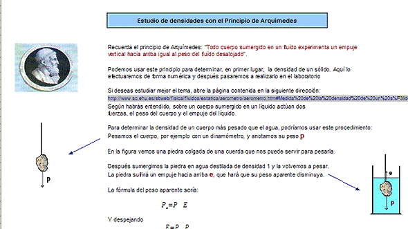 Como práctica prepararemos unos apuntes tomando como modelo unos ya confeccionados sobre el Principio de Arquímedes. Abarcan una página que se puede leer y trabajar en la misma hoja de cálculo, o bien usarla impresa. Se podrá abordar antes o después de su estudio en en laboratorio. Lo puedes consultar en el archivo arquimedes.ods, pero es muy importante que tú intentes confeccionar otro similar. Puedes seguir este tema o plantearte otro totalmente distinto.