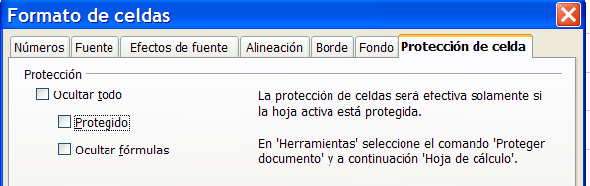 Después pasa al menú Herramientas y pide Proteger Documento... > Hoja de Cálculo. Puedes ignorar la contraseña por ahora. Una vez activada la protección, si intentas escribir algo fuera de esas dos celdas no te dejará.