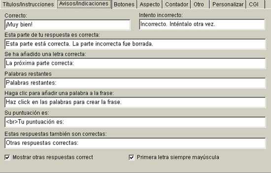 observa las dos casillas: Mostrar otras respuestas correct y Primera letra siempre mayúscula