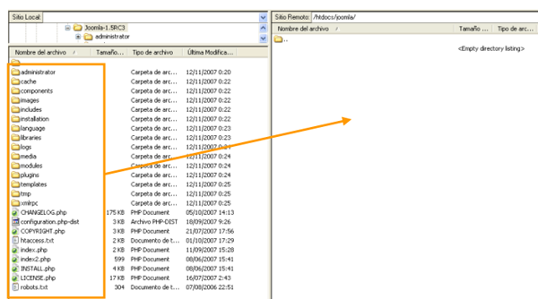 - Subir las carpetas y los archivos a la carpeta del servidor remoto, para lo que utilizaremos un cliente FTP y decidiremos si los copiamos en la carpeta raíz o en una previamente creada. Puede ser recomendable crear una carpeta, llamada "joomla", por ejemplo, para realizar la instalación en ella. Algunos servidores no permiten tener las opciones de escritura necesarias en la carpeta por defecto, y de esta forma podemos tener las condiciones adecuadas.