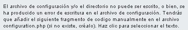 En el Paso 7 de la instalación web en el servidor puede aparecer un mensaje relativo a que el archivo de configuración de Joomla! "configuration.php" no ha podido ser escrito en el servidor, probablemente porque no tengamos permisos de escritura en la carpeta donde hemos instalado Joomla!, y porque estos permisos no puedan ser modificados, ya que forman parte de la propia configuración del servidor decidida por el proveedor del servicio.