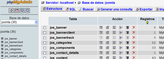 Accedemos a phpMyAdmin, tal y como se explicó en el capítulo 2, y seleccionamos nuestra base de datos.