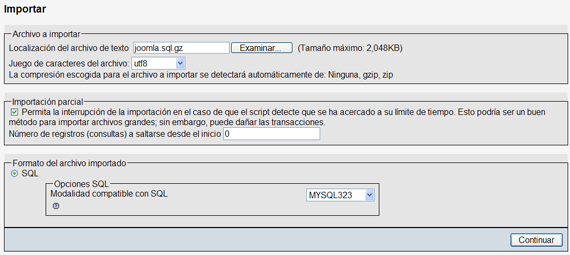 4. Localizamos el archivo que descargamos cuando hicimos la restauración de la base de datos, "joomla.sql.gz", por ejemplo, y elegimos la modalidad compatible con SQL "MYSQL323". Decidimos "Continuar".