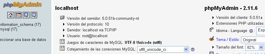 PhpMyadmin tiene inicialmente sólo creado un usuario, el usuario "root", sin contraseña asignada. Esto supone una cierta vulnerabilidad si nuestro servidor estuviese disponible en una red. No es el caso, y no nos preocuparemos por este tema hasta que sea necesario. Aunque encontraremos probablemente el correspondiente aviso al entrar por primera vez a gestionar phpMyAdmin.