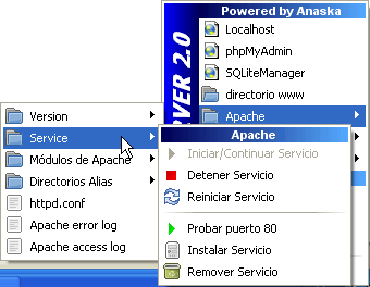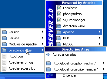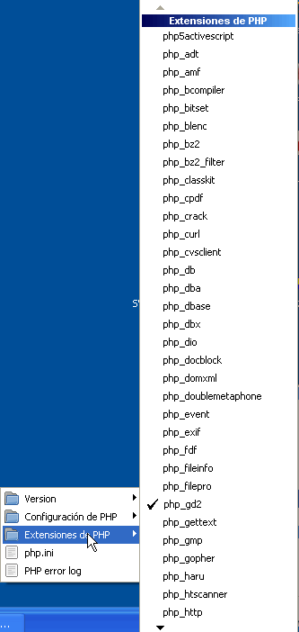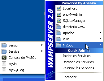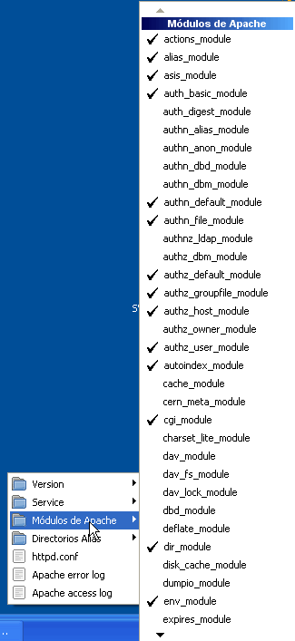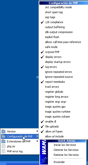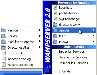 Si haces clic con el botón derecho del ratón, sobre este icono se despliega un menú que nos permite decidir el idioma que utilizará WAMP. Elegimos "spanish" si así es nuestro deseo.