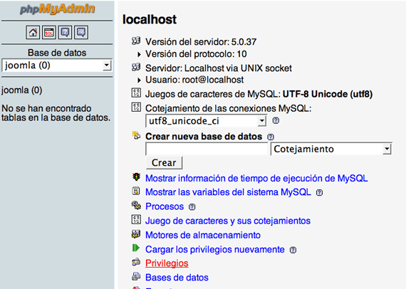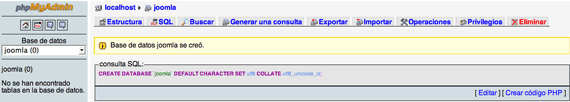 Procedemos y ya tenemos la base de datos creada. Está vacía, sin tablas, la instalación de Joomla! se encargará de crear lo que necesita.