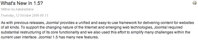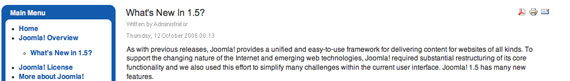 Aprovechando los ejemplos añadidos durante la instalación, veamos qué ocurre cuando queremos ver un contenido, por ejemplo, el referenciado en el ítem "What's New in 1.5" del menú principal (Main Menu).