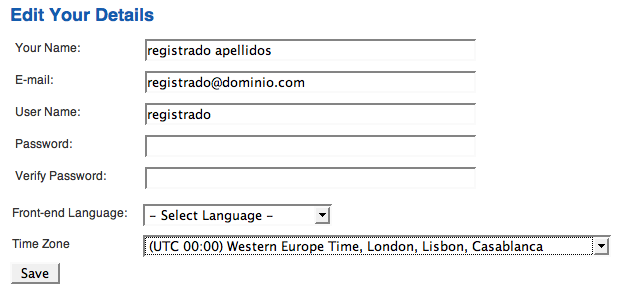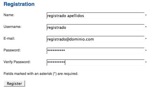 Una vez que seleccionamos la opción "Registrar" nos aparece la ventana de registro de un nuevo usuario desde el Front-end. Está claro que la dirección de correo electrónico debe ser una dirección válida. Por defecto, los nuevos usuarios que registra Joomla! desde el Front-end son considerados usuarios del tipo "Registrado".