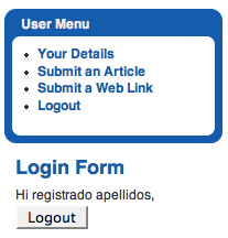 Lo primero que observamos al ingresar en el sistema con las claves de usuario "registrado", es que aparece un nuevo menú, específico del usuario, y que el formulario de acceso se ha transformado, permitiendo la desconexión del sistema (Logout).