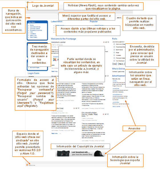 Ya que decidimos en la instalación de Joomla! que se instalasen datos de ejemplo, muestra por defecto un sitio web cuya página de inicio (Frontpage) presenta muchas partes diferenciadas: logo, formularios de acceso, menús, encuesta, acceso a noticias, sindicación1, etc.; y que podemos observar en la siguiente imagen.
