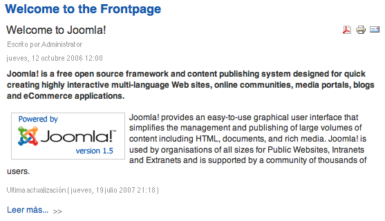 Lo mismo ocurre en el Front-end, pero debe entenderse que esta traducción sólo se realiza en aquellos textos que Joomla! crea de forma automática, no en los títulos de los artículos de contenido, texto de los artículos, nombre de los menús, etc.; que siempre dependen de lo que haya escrito el autor.