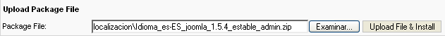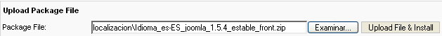 3 Procedemos de la primera forma, localizando el archivo que contiene el idioma español para el Front-end en nuestro equipo ("Examinar"), y decidiendo que lo suba y lo instale ("Upload File & Install")