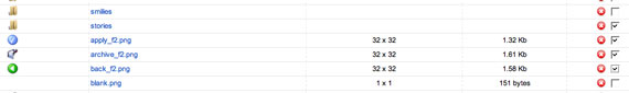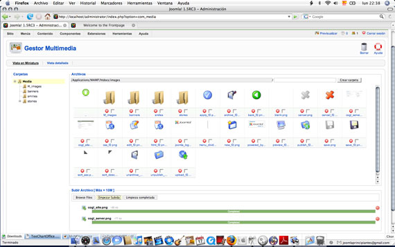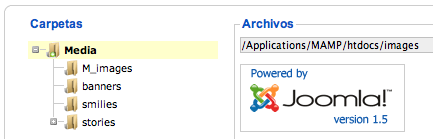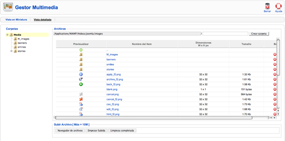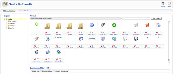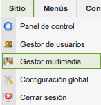 accedemos a la Administración de los elementos multimedia. Realmente se trata de un administrador de archivos del tipo bmp, csv, doc, epg, gif, ico, jpg, odg, odp, ods, odt, pdf, png, ppt, swf, txt, xcf, xls, de un explorador de archivos o programa FTP, especialmente útil cuando tenemos derechos de administración, pero no podemos acceder con un programa cliente de FTP al servidor.