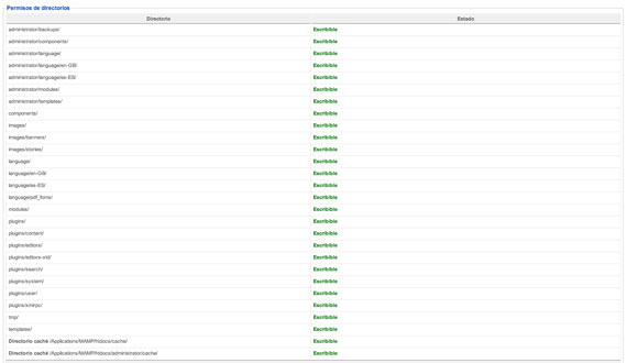Permisos de directorios. Donde se muestran las carpetas de nuestra instalación Joomla! que necesitan ser "escribibles" para que todo funcione con corrección. La manipulación de los permisos de estas carpetas, así como de los archivos, es fundamental dominarla cuando nuestro espacio esté disponible en la red Internet.