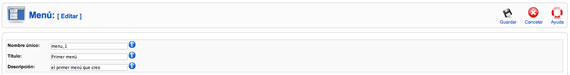 Debemos diferenciar lo que significa la edición de un menú, a la que accedemos desde el área de gestión de menús, y que permite únicamente modificar el Nombre único, Título y Descripción del menú.