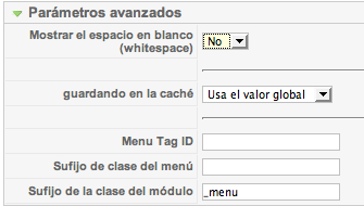 En nuestro caso, nos puede interesar que este menú creado tenga la misma apariencia que el resto de los menús, y que podemos conseguir asignándole un estilo existente entre los estilos de la plantilla del sitio web. Para ello indicamos que el sufijo de la clase del módulo sea "_menu".