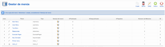 1 Nos situamos en la ventana de gestión de menús. Seleccionamos el menú "othermenu" y eligimos la opción "Copiar" de la barra de herramientas.