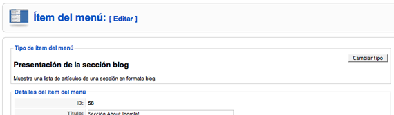 Si elegimos un ítem de menú desde el área de trabajo de gestión de un menú, y seleccionamos la opción "Editar" de la barra de herramientas, accedemos a la edición del ítem de menú, donde aparece una ventana con las opciones definidas en "detalles", que permite modificar todas los parámetros salvo la URL que define el vínculo asociado al ítem de menú, y la relación de "parámetros" similares a los mencionados en el apartado anterior, permitiendo su modificación si así se desea.