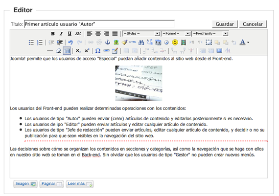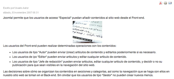 Sin duda, una de las mejores opciones que presenta Joomla!, es que existan usuarios que puedan añadir contenidos directamente desde el Front-end. La jerarquización de los usuarios en diferentes niveles de acceso, una buena planificación de la estructura de los contenidos en el sitio web y una adecuada distribución de funciones de los usuarios para participar en la web, pueden explotar la potencialidad de añadir contenidos desde el Front-end al máximo, y así conseguir espacios de calidad.