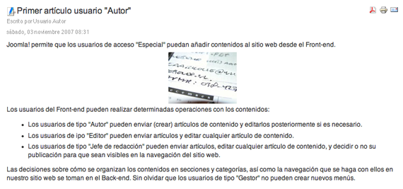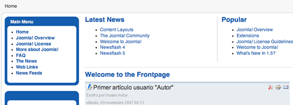 6 Si accedemos a Joomla! desde el Front-end como usuario de tipo "Editor", y ya que el artículo creado por el usuario "Autor" fue situado en el Frontpage, el usuario "Editor" verá algo de este tipo.