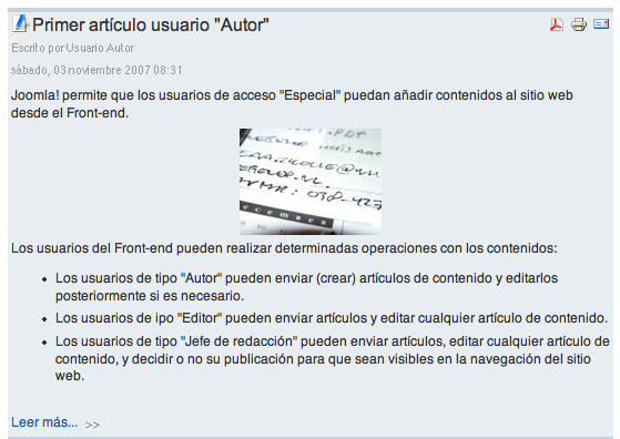 Con una visualización de artículo tal y como decidió el usuario "Autor", observamos el vínculo "Leer más" que permitirá la lectura completa del artículo.