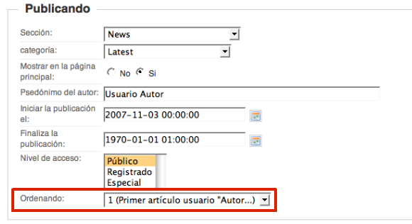 8 Si el usuario "Editor" accede a la ventana de edición de un artículo se encuentra las mismas opciones que un usuario de tipo "Autor", salvo que ahora ya puede ordenar el artículo dentro de los artículos donde se encuentre clasificado.
