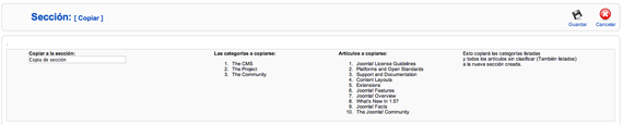 Copiar. Donde se inicia el proceso de copia exacta de la sección, sus categorías y los artículos de contenido correspondientes.