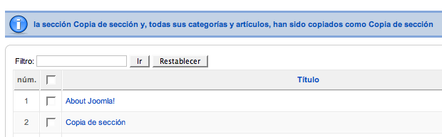 Copiar una sección supone copiar íntegramente todo su contenido, es decir, las categorías creadas en la sección, y los artículos de contenido incluidos en todas las categorías, también los que se encuentren archivados o en la papelera.
