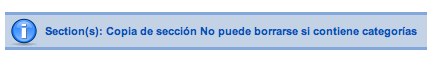 Borrar una sección supone eliminar cualquier relación de contenidos con esa clasificación, por lo que es necesario que no tenga ninguna categoría asociada ni ningún artículo incluido. En caso de que se quisiera borrar una sección y no se reunieran estas dos condiciones, aparecería el correspondiente mensaje de error.