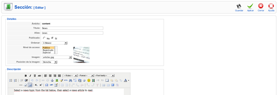 Si accedemos a la edición de una sección, aparecen dos espacios diferenciados, "Detalles" y "Descripción". La barra de herramientas completa las operaciones que se pueden realizar.