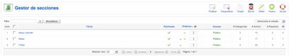 Crear una nueva sección se decide en el Panel de Gestión de Secciones, y todas sus opciones y posibilidades son equivalentes a las vistas en el apartado anterior, salvo que no podemos reordenar la presentación de la sección que hasta haya sido creada.