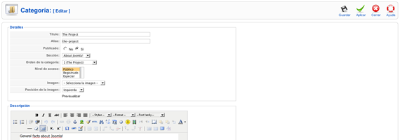 Si accedemos a la edición de una categoría, aparecen dos espacios diferenciados: "Detalles de la categoría" y "Enlaces al menú". La barra de herramientas completa las operaciones que se pueden realizar.