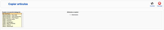 Copiar un artículo de contenido supone decidir en qué sección/categoría se va a realizar una copia. Puede decidirse lo mismo de artículos no clasificados, o bien que sean copiados para no ser clasificados. Se mantiene una copia en la sección/categoría original.