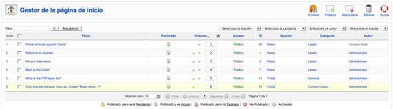 Una vez que accedemos al área de trabajo, observamos la relación de todos los artículos de contenido sobre los que se ha decidido que se presenten en la portada de nuestro sitio web.