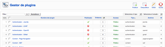 Al igual que los componentes y módulos pueden ser instalados/desinstalados, configurados y publicados (habilitados) desde el panel de administración de Joomla!