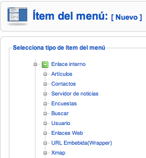 Y decidimos crear un ítem nuevo, para elegir, desde luego, un ítem del tipo "Enlace interno: Xmap".
