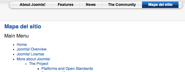 Este primer mapa sólo tiene seleccionados para ser mostrados los ítems del "mainmenu", pero podemos añadir que muestre la navegación de otros menús, por ejemplo: "usermenu", "othermenu" y "keyconcepts". Una vez seleccionados le decimos al sistema que guarde esta elección, claro, con el comando "Guardar" que aparece justo debajo de la relación de menús del sitio web.